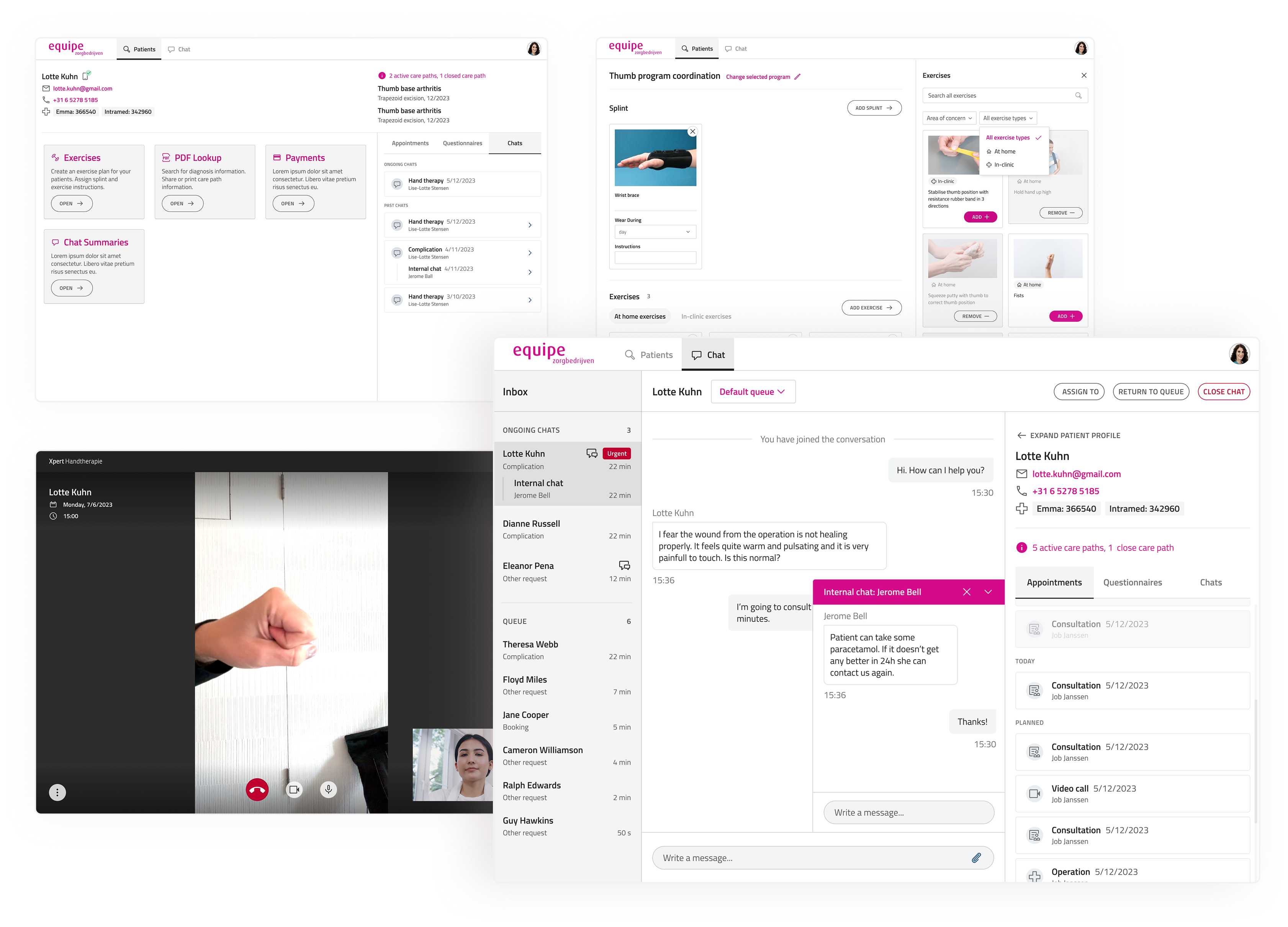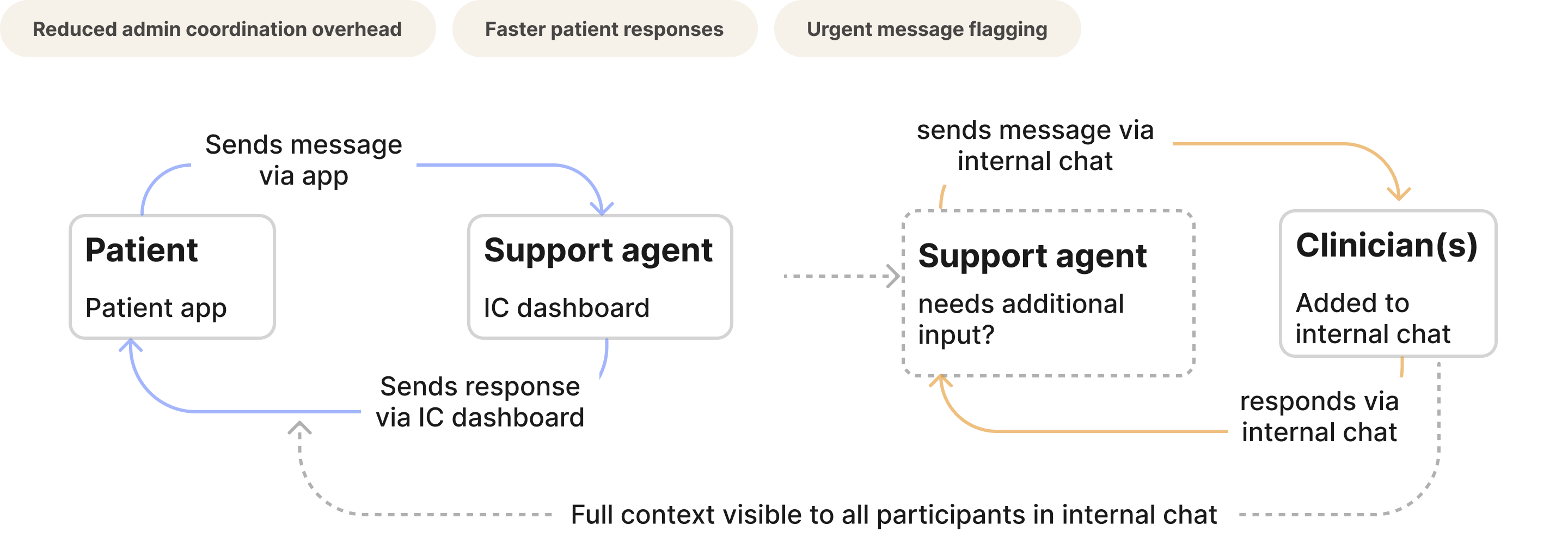 The most complex feature: a three-way communication system where patients could message their clinic, support agents could loop in clinicians via internal chat, and everyone had full contextual visibility.