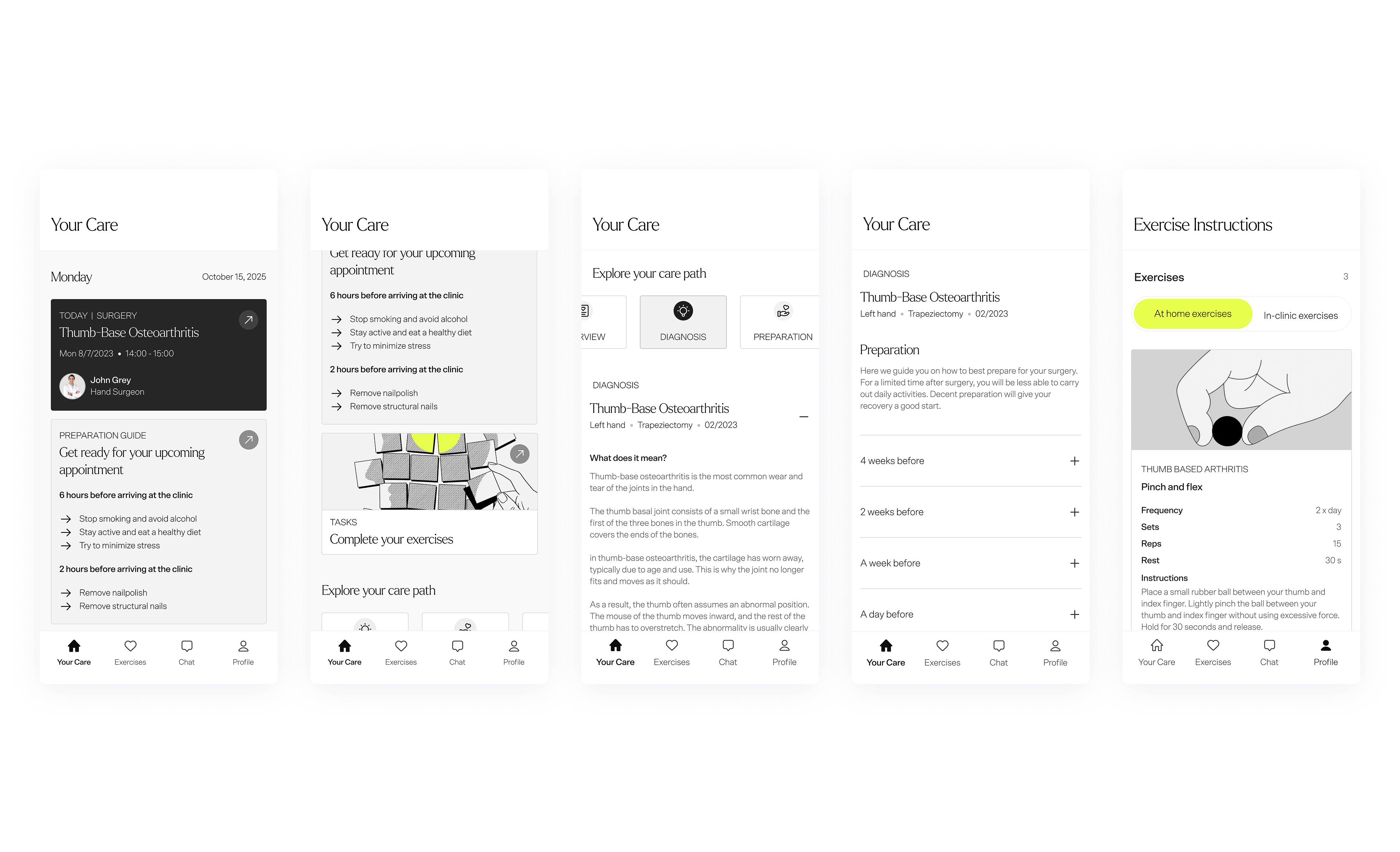 The platform covers the main parts of a typical digital care journey such as preparation, recovery, tasks, communication, and content. Everything was built as a modular system that could be adjusted for different providers, medical areas, and patient groups.